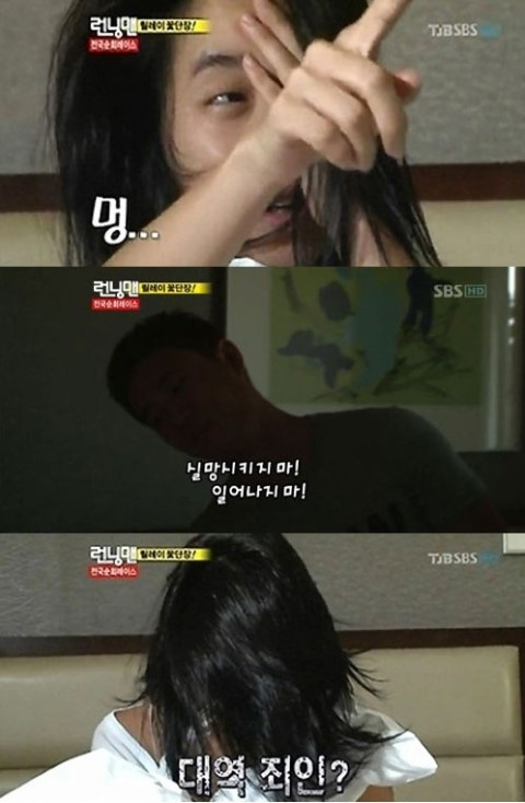 송지효는 당시 방송에서 잠에서 방금 깬 모습으로 부은 얼굴과 정리 안된 머리스타일을 하고 있다. 이를 본 개리는 "실망시키지마,일어나지마!"라고 말하며 보는 이들을 폭소케했다.