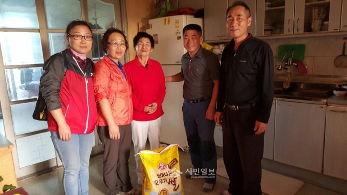 최근 저소득 노인가구를 방문한 경기 동두천시 생연2동 새마을남녀지도자회가 사랑의 쌀을 전달했다. 사진은 쌀 기증 후 기념촬영하고 있는 새마을남녀지도자회와 노인의 모습.(사진제공=동두천시)