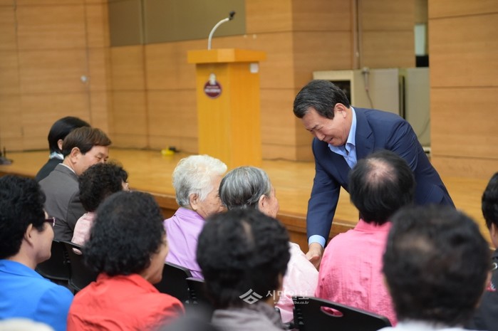 나진구 서울 중랑구청장이 노인의 날인 지난 2일 오후 시립중랑노인종합복지관에서 열린 '2015년 아름다운 어르신 대축제'에 참석했다. 사진은 나 구청장이 기념행사에 참석한 노인과 악수를 하는 모습.(사진제공=중랑구청)