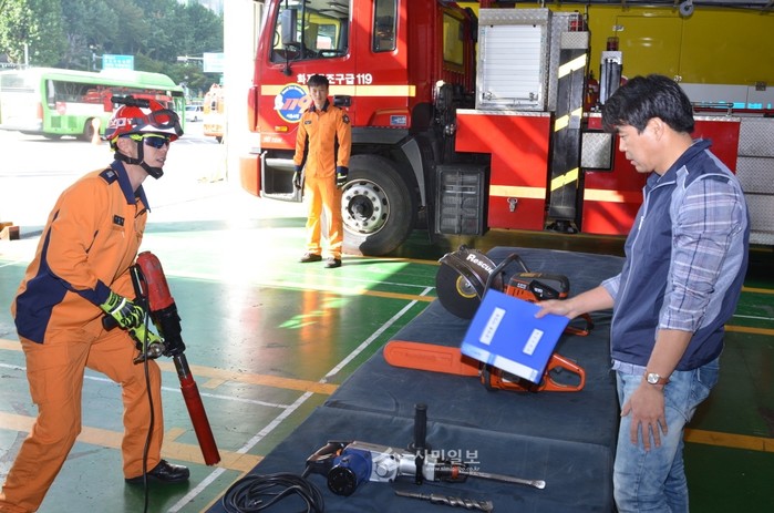 서울 강남소방서는 5일 본서 차고 및 광장에서 서울소방재난본부 주관으로 2015년 소방 장비 검열을 실시했다. 사진은 이날 한 소방대원이 구조 장비 조작 상태를 점검 중인 모습.(사진제공=강남소방서)