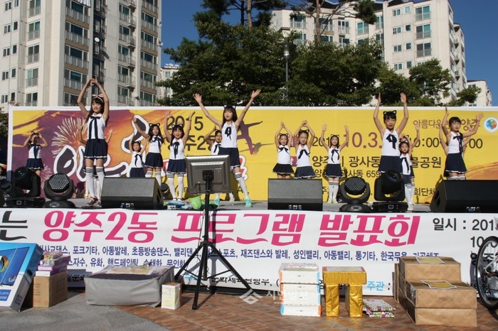 경기 양주시 양주2동 주민센터는 지난 3일 고읍지구내 하늘물공원에서 '2015 야호페스티벌'을 개최했다. 사진은 행사에 참가한 어린이들이 주민자치 프로그램 발표를 하는 모습.(사진제공=양주시청)