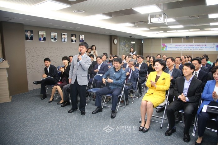 최근 서울 서초구청 5층 대회의실에서 조은희 구청장(앞줄 오른쪽에서 세 번째), 국장, 과장, 동장 등 5급 이상 간부직 공무원들을 대상으로 실시한 ‘친절 리더십 교육’에 참석한 직원들이 교육을 받고 있다.(사진제공=서초구청)