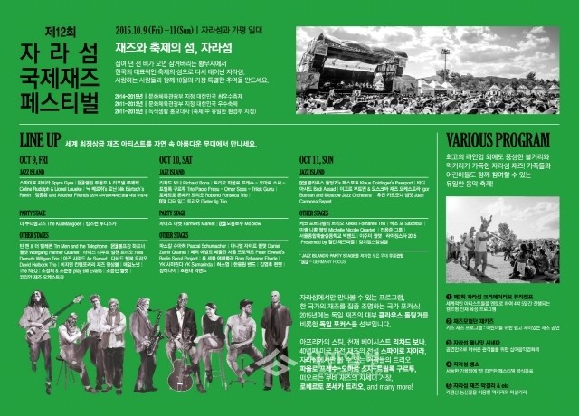 국가대표 음악축제인 자라섬재즈는 올해도 어김없이 재즈 레전드(Legend)들이 정열적이고 뜨거운 리듬의 다양한 스펙트럼을 선보이며 12번째 재즈 스토리를 만들게 된다. 지난해까지 자라섬재즈는 누적관객 170만명, 53개국 777명의 아티스트가 참여해 명실상부한 국제적인 음악축제로 자리매김했다.