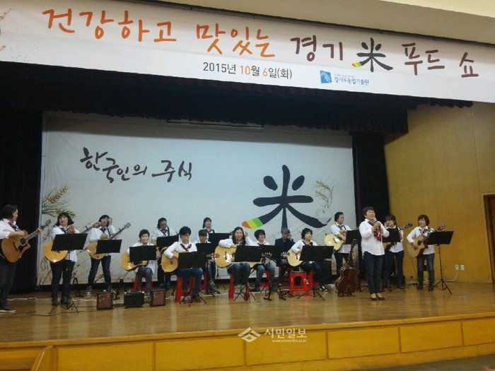 경기 양주시생활개선회 통기타반 '행복시스터즈'는 지난 6일 경기도농업기술원에서 개최한 '건강하고 맛있는 경기米 푸드쇼'에 참가했다. 사진은 이번 푸드쇼에서 공연 중인 행복시스터즈의 모습.(사진제공=양주시청)