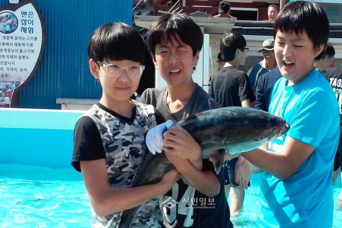 경북 구미시 인동중학교가 지난 6일 영덕 차유 어촌체험마을에서 바다 생태 및 어촌 생활 탐방을 실시한 가운데 학생들이 수산물 맨손으로 잡기 프로그램에서 물고기를 잡아 들어올리고 있다.(사진제공=구미교육지원청)