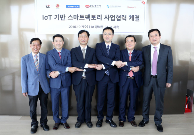 KT와 레토르트 식품 전문기업 (주) 교동식품, olleh GiGA IoT Alliance 회원사 관계자들이 KT 광화문 빌딩 East에서 'IoT를 적용한 스마트 공장 구현'에 관한 양해각서를 체결하고, 충북 옥천 교동식품 공장에 첫 사례를 구축한다고 밝혔다. (사진 좌측으로부터 iSmart 최문기 대표이사, 인텍전기전자 김웅회 전무이사, 교동식품 김병국 대표이사, KT 미래융합사업추진실 유용규 상무, 어드밴텍케이알 정준교 지사장, 선진시스템 서선택 대표이사)