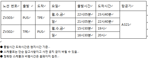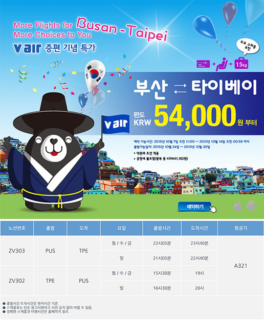 브이에어는 10월 25일부터 부산에서 타이페이까지 주 4회(월/수/금/일) 왕복하게 된다.