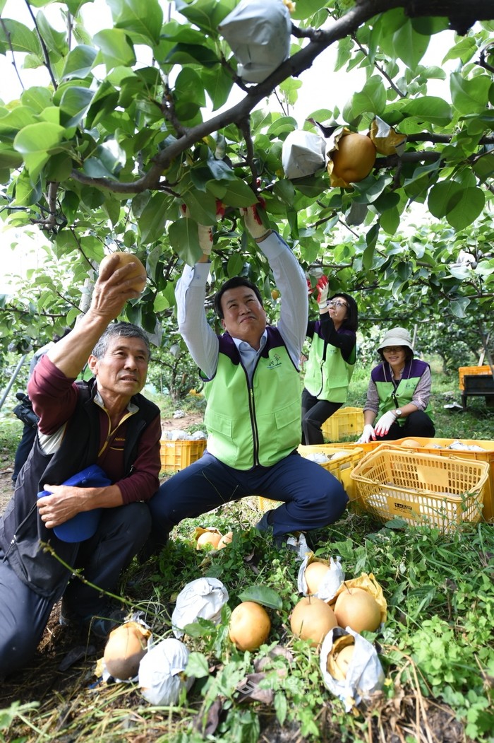 나진구 중랑구청장(가운데)은 최근 간부 공무원 30여명과 함께 구 대표 특산물인 '황실배' 수확기를 맞아 일손 부족으로 어려움을 겪고 있는 황실배 농가인 신내동 대훈농원을 찾아 봉사활동을 진행했다.(사진제공=중랑구청)