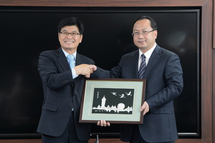 최근 중국 다롄시 대표단이 우호교류를 위해 세종시를 방문한 가운데 탕쥔(唐軍) 다롄시 당서기(오른쪽)가 이춘희 시장에게 조계공예품을 전달하고 있다.(사진제공=세종시청)