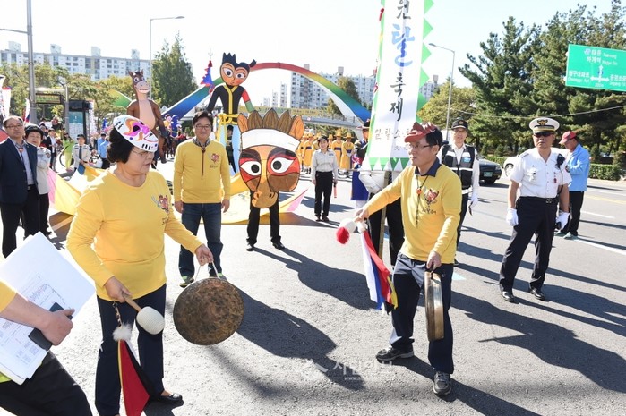 서울 노원구는 지난 9일 오전 10시부터 노원의 중심거리인 노원역 사거리대로에서 함께 춤추며 즐기는 ‘2015년 노원 탈축제’를 개최한 가운데 김성환 노원구청장(오른쪽)이 노원 탈축제 퍼레이드의 시작을 알리는 징을 치고 있다.(사진제공=노원구청)