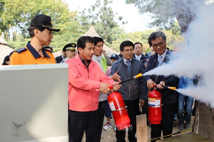 최근 실시된 서울 강동선사문화축제 사전 안점점검에 참석한 성임제 의장(왼쪽에서 두 번째)이 암사동 유적지에서 소화기를 분사하며 황교안 국무총리(오른쪽에서 두 번째)와 함께 안전점검을 실시하고 있다. (사진제공=강동구의회)
