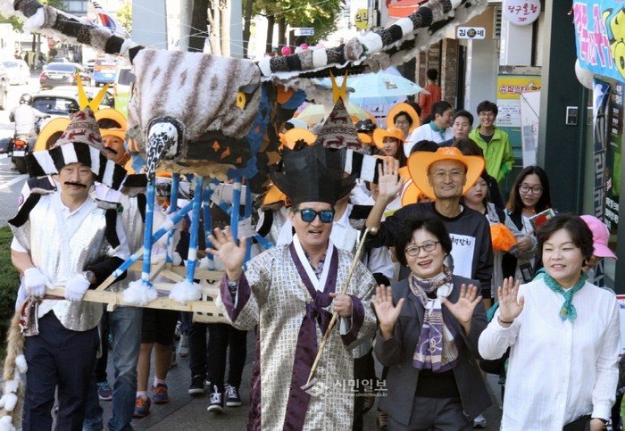 서울 관악구가 개최한 관악책잔치 행사의 메인 이벤트인 '플래시몹'에서 유생복장의 유종필 구청장이 동화 속 주인공으로 분장한 주민 등과 함께 길거리 행진을 하며 손을 흔들고 있다. (사진제공=관악구청)