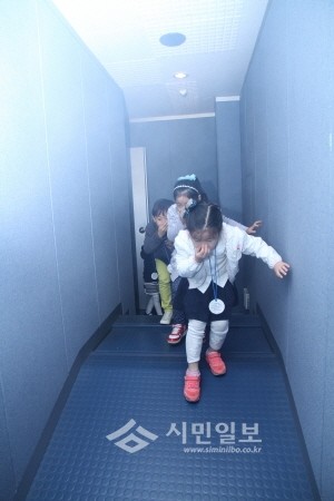 서울 동작소방서는 최근 소방서 3층 소방안전체험교실에서 사랑유치원 어린이 20여명에게 소방안전교육을 실시했다. 사진은 교육에 참석한 어린이들이 코와 입을 막으면서 비상구 등을 따라 대피하는 연기대피체험을 하는 모습.(사진제공=동작소방서)