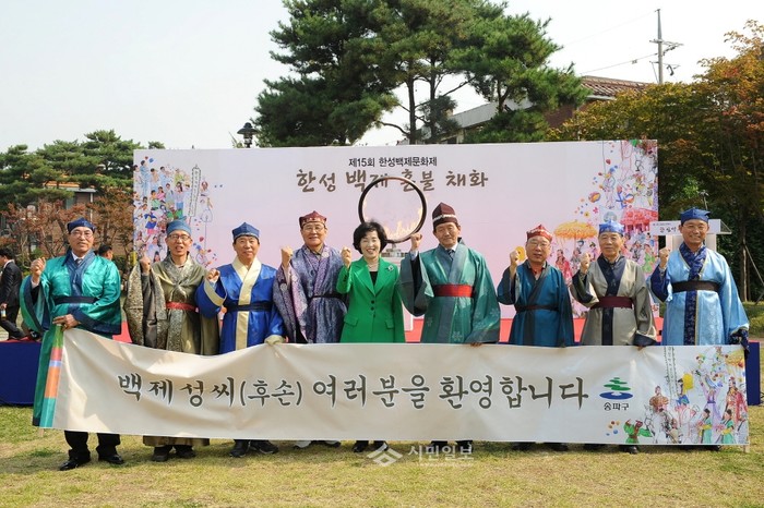 최근 '제15회 한성백제문화제'를 맞아 송파구 경당역사공원에서 열린 '혼불채화식'을 마친 박춘희 구청장이 행사 참가자들과 함께 '파이팅'을 외치며 기념촬영을 하고 있다.(사진제공=송파구청)
