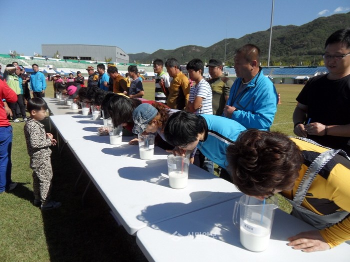 최근 경기 연천군 연천읍 승격 제36주년을 기념하는 '연천읍민 체육행사'가 열린 연천공설운동장에서 주민들이 '우유마시기 대회'에 참여해 컵에 담긴 우유를 마시고 있다.(사진제공=연천군청)
