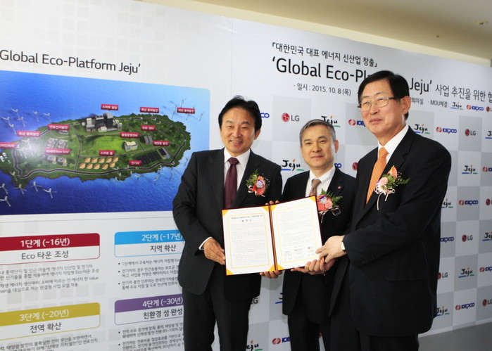 [시민일보=여영준 기자]한전(사장 조환익)은 제주특별자치도(도지사 원희룡), (주)LG(대표이사 하현회)와 함께 지난 8일 오후 2시 서울 중구 포스트타워에서 '글로벌 에코 플랫폼 제주(Global Eco-Platform Jeju)' 사업의 공동 추진을 위한 사업협력 양해각서(MOU)를 체결했다.