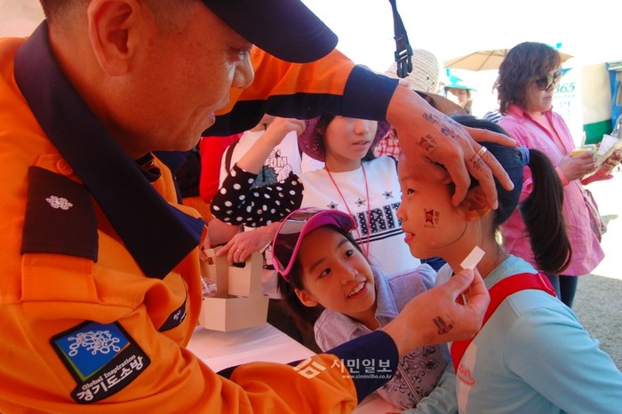 경기 안성소방서는 최근 안성맞춤랜드에서 진행된 '2015 안성맞춤 남사당 바우덕이 축제'에서 소방안전 지원본부를 운영해 참여 어린이에게 소방캐릭터 판박이를 붙여주고 있다.(사진제공=안성소방서)