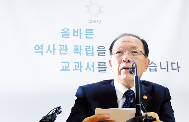 황우여 사회부총리 겸 교육부 장관이 12일 오후 정부세종청사 교육부 브리핑룸에서 국정교과서로 결정한 배경과 추진 계획 등 ‘역사교과서 발행체제 개선 방안’에 대해 발표하고 있다.