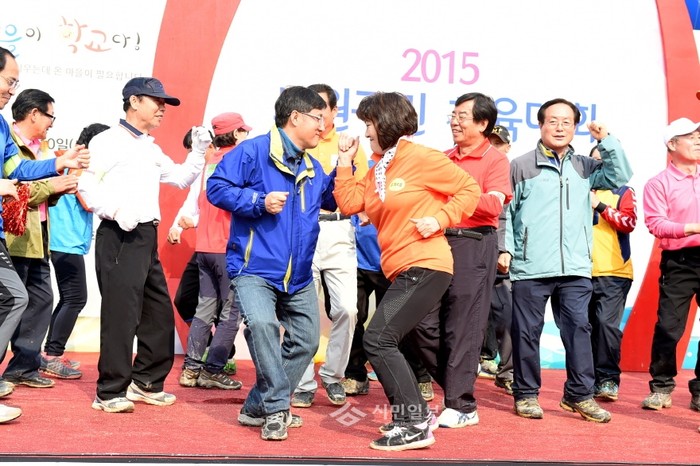 서울 노원구가 '노원구민의 날'을 맞아 지난 10일 중계동 노해근린공원 운동장에서 구민들의 화합과 소통을 위한 '2015 노원구민 체육대회'를 개최해 김성환 구청장(가운데)과 주민들이 댄스 경연을 펼치고 있다.(사진제공=노원구청)
