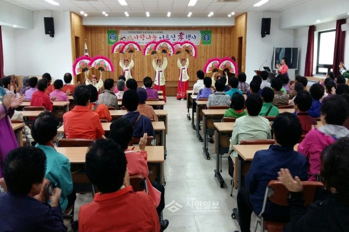경북 구미시 농업기술센터에서 지난 12일 행복한 농촌가정 육성 프로젝트 시범사업의 일환인 '사랑나눔 효행사'를 개최해 생활개선 회원과 지역 노인 150여명이 참석한 가운데 전통무용단이 춤을 선보이고 있다.(사진제공=구미시청)