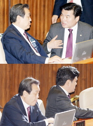 본회의가 열린 13일 오전 서울 여의도 국회 본회장에서 새누리당 김무성 대표와 원유철 원내대표가 굳은 표정으로 대화를 나누다 풀리지 않는 듯, 원유철 원내대표가 등을 돌리며 자리를 뜨고 있다.