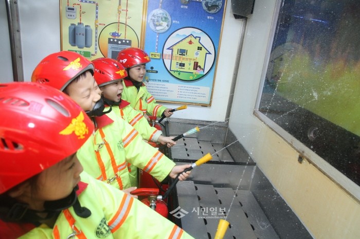 서울 동작소방서는 지난 12일 오전 10시 동작구 보라매공원에서 애플트리에듀센터 등 4곳 어린이 90여명을 대상으로 119이동안전체험차량 소방안전체험을 실시했다. 사진은 체험에 참석한 어린이들이 소화기 사용 실습을 하는 모습.(사진제공=동작소방서)