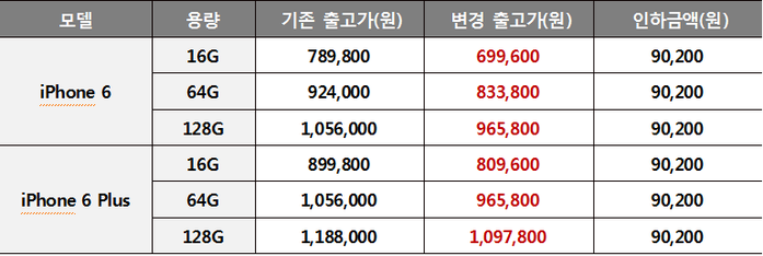 iPhone 6 16G 699,600원, 64G 833,800원 등 iPhone 6, 6 Plus 全 기종 9만원 가량 인하