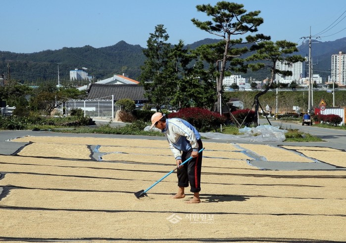 지난 13일 전남 장흥군 우산마을의 한 농가에서 추수한 벼를 가을 햇볕에 정성스럽게 말리고 있다.(사진제공=장흥군청)