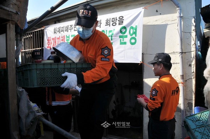 서울 동작소방서는 지난 13일 오후 2시 서울 동작구 성대로에서 화재 발생으로 피해를 입은 저소득가정에 '화재피해복구 지원'을 진행했다. 사진은 소방서 관계자들이 대상 주택에 대한 잔존물을 제거하는 모습.(사진제공=동작소방서)