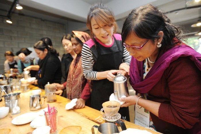 지난 13일 서울 송파구 참살이실습터에 방글라데시 공무원 연수단이 ‘성 주류화 경제적 역량강화 및 일자리 양성평등정책’ 벤치마킹을 위해 방문해 바리스타 교육을 체험하고 있다.(사진제공=송파구청)