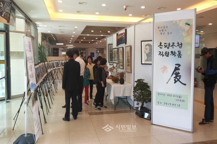 서울 은평구는 최근 은평 누리 축제와 연계해 '향기 있는 사람이 되고 싶다'라는 부제하에 구청 본관 1층에서 '은평구청 직원 작품 전시회'를 개최해 주민들이 복도 벽면에 걸린 작품을 감상하고 있다.(사진제공=은평구청)