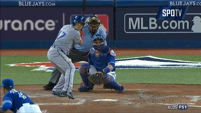15일(한국시간) 열린 2015 메이저리그 텍사스 레인저스와 토론토 블루제이스의 아메리칸리그 디비전시리즈(ALDS) 5차전에서 텍사스는 추신수의 홈런 등에 힘입어 2:1로 앞서 있다.