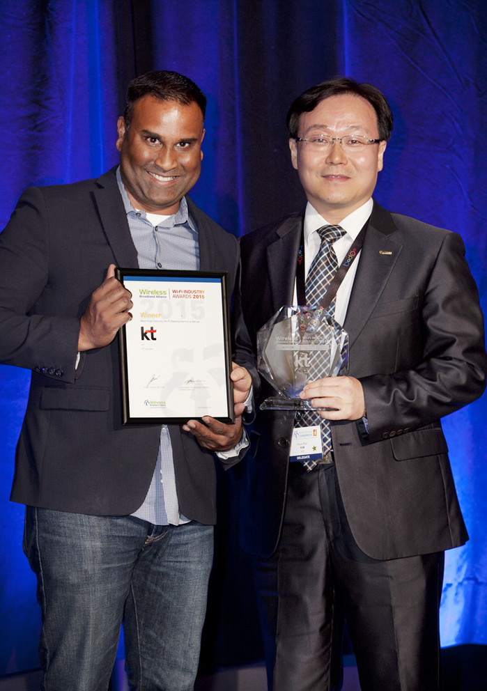 WBA 이사회 멤버인 KT 융합기술원 가입자망기술담당 김현표 상무(우측)가 ‘WiFi Industry Awards 2015’ 현장에서 ‘최고 와이파이 품질 공간(Best High Density WiFi Deployment in a Venue)’ 수상 후 미국 산호세 시(市) CIO(Chief Information Officer), Vijay Sammeta와 기념 촬영을 하고 있다.