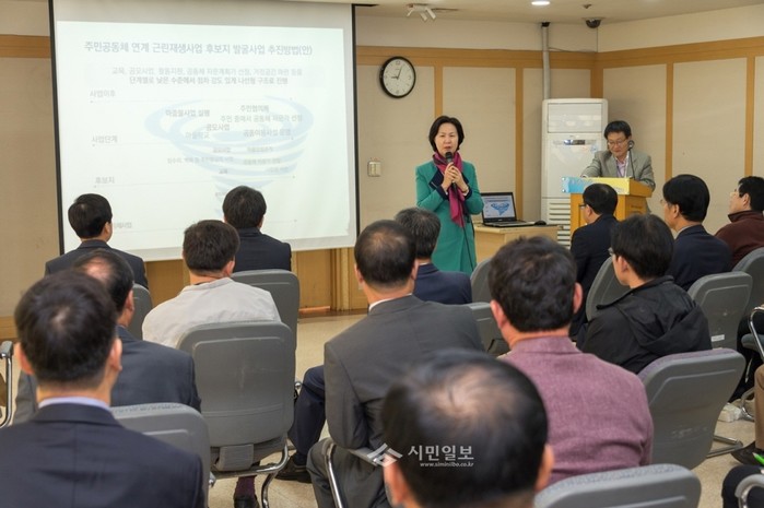 김수영 서울 양천구청장은 최근 구청 소통실에서 열린 '생각마당 도시재생 포럼'에 참석해 주민공동체 연계 근린재상사업 후보지 발굴사업 추진방법과 관련해 토론을 진행하고 있다.(사진제공=양천구청)