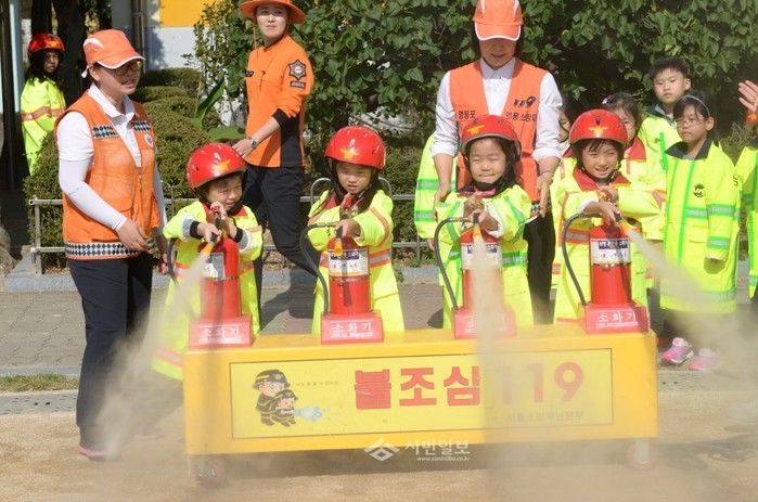 서울 영등포소방서는 지난 14일 오전 여의도동 소재 윤중초등학교 병설유치원 원아 100여명을 대상으로 소방안전체험차량을 이용한 '찾아가는 어린이 소방안전체험 교실'을 운영해 어린이들이 물소화기 체험을 하고 있다.(사진제공=영등포소방서)