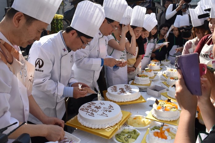 김성환 노원구청장(왼쪽에서 두 번째)이 지난 14일 오후 1시30분 노원구 상계동 노원역 부근 노원문화의 거리에서 열린 '소상공인들의 협업사업 공동브랜드 행사'를 찾아가 케이크 만들기를 하며 서울시 소상공인들을 응원하고 있다.(사진제공=노원구청)