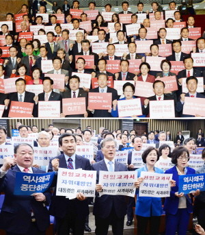 15일 오전 서울 여의도 국회에서 열린 새누리당 역사교과서 국정화 관련 긴급정책의원총회을 마친 김무성 대표와 원유철 원내대표를 비롯한 당 지도부 및 의원들이 국회 본청 로텐더홀에서 ‘국민 통합을 위한 올바른 역사교과서 만들기’ 결의문을 발표한 뒤 구호를 외치고 있다(위). 새정치민주연합 문재인 대표와 이종걸 원내대표 등 의원들이 15일 서울 여의도 국회에서 열린 긴급의총에서 역사교과서 국정화와 황교안 국무총리의 일본 자위대 입국허용 답변을 규탄하는 결의대회를 하고 있다.