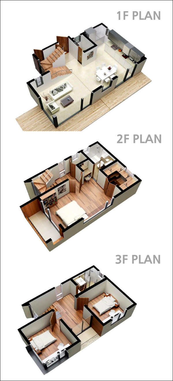 1층은 거실, 주방, 욕실, 2층은 안방, 욕실, 드레스룸, 테라스, 3층은 방2개, 가족실, 욕실, 테라스, 그리고 다락은 별도 옵션으로 구성된다. 특히 1층의 거실과 주방, 식당을 한 공간으로 꾸미고, 2층은 마스터룸의 전면에 외부 발코니가 설치되며, 3층은 2개의 방 사이에 가족실을 마련해 추후 가족수 변화에 대응할 수 있게 하였다.