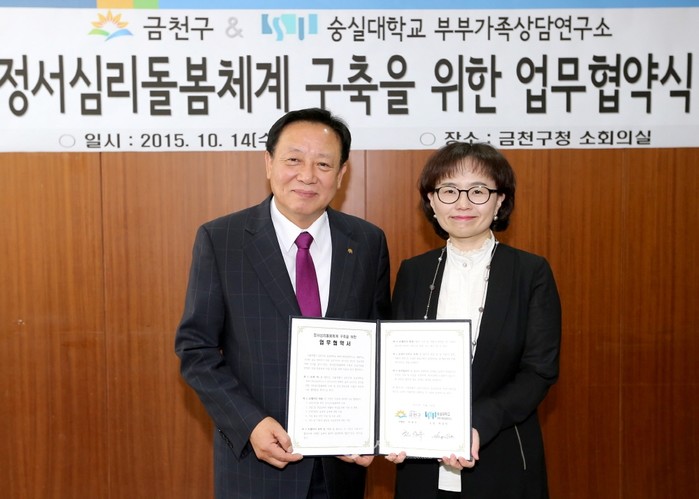 서울 금천구는 지난 14일 오전 11시 구청장실에서 '숭실대학교 부부가족상담연구소와 정서심리돌봄체계 구축에 관한 업무협약'을 체결했다. 사진은 협약서를 들고 기념촬영하는 차성수 구청장(왼쪽)과 관계자의 모습.(사진제공=금천구청)