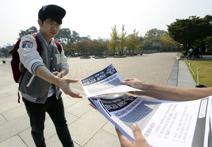 최근 서울 성북구 고려대학교에서 일본군 위안부 문제 해결을 위한 대학생 네크워크인 '평화나비' 네트워크 소속 고려대 학생들이 한국사 교과서 국정화를 반대하는 유인물을 나눠주고 있다.