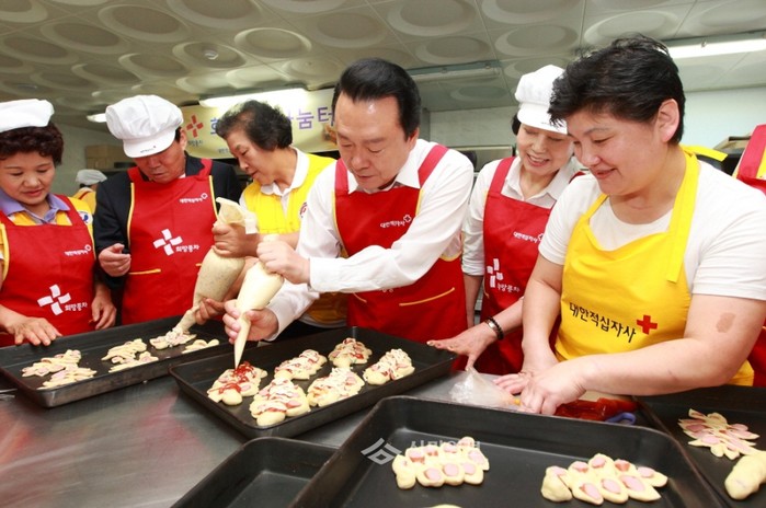 | ▲ 노현송 구청장이 대한적십자가 직원들과 함께 지역내 어려운 가정에 나눠줄 빵을 만들고 있는 모습.(사진제공=강서구청) | ||