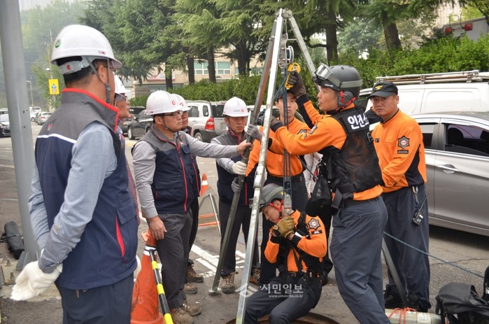 인천 남동소방서 119구조대는 최근 본청사 옆 맨홀에서 KT 배전선 수리팀 10여명을 대상으로 '맨홀 사고대비 안전교육 훈련'을 실시해 한 소방대원이 교육을 위해 맨홀로 들어가고 있다.(사진제공=남동소방서)