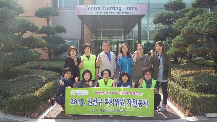 경기 수원시 권선구 복지위원협의회에서는 최근 수원 중앙양로원을 방문해 자원봉사 활동을 전개했다. 사진은 복지위원협의회 관계자들이 기념촬영한 모습.(사진제공=권선구청)