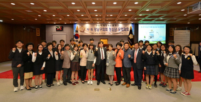 서울 강남구의회는 최근 본회의장에서 24개 중학교 학생들을 대상으로 지방의회 모의체험 활동인 '청소년 모의의회'를 개최하며 학생들, 김명옥 의장(가운데), 교육지원청 교육장, 의원들이 파이팅을 외치고 있다.(사진제공=강남구의회)