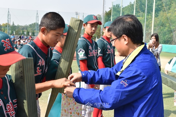 김성환 서울 노원구청장(오른쪽)이 지난 18일 오전 11시 불암산 야구장에서 열린 ‘제7회 노원구청장기 및 노원리틀야구단 졸업식’에 참석해 졸업생들에게 표창장과 야구방망이를 전달하고 있다.(사진제공=노원구청)