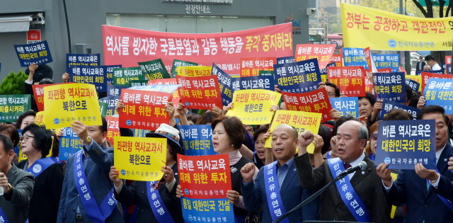 한국자유총연맹 서울특별시지부 회원들이 20일 오후 서울 광화문 동화면세점 앞에서 '올바른 역사교육' 을 위한 대국민 기자회견에서 구호를 외치고 있다.