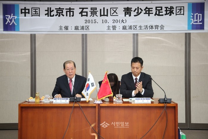 지난 20일 박홍섭 마포구청장(왼쪽)이 마포구청에서 자매도시인 '중국 베이징시 석경산구 청소년 축구단 환영식'에 참석해 인사말을 전하고 있다. 환영식 이후 서울월드컵경기장에서 마포구청장배 어린이 축구대회 우승팀과 석경산구 청소년 축구단이 친선전을 치르며 선의의 경쟁을 펼쳤다. (사진제공=마포구청)