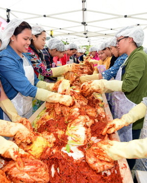 21일 오후 경기도 이천시 대한적십자사 경기도지사 동부희망나눔봉사센터에서 이천시 거주 다문화가족 및 (주)콘티넨탈 오토모티브 시스템 임직원들이 김장김치를 담그고 있다.
