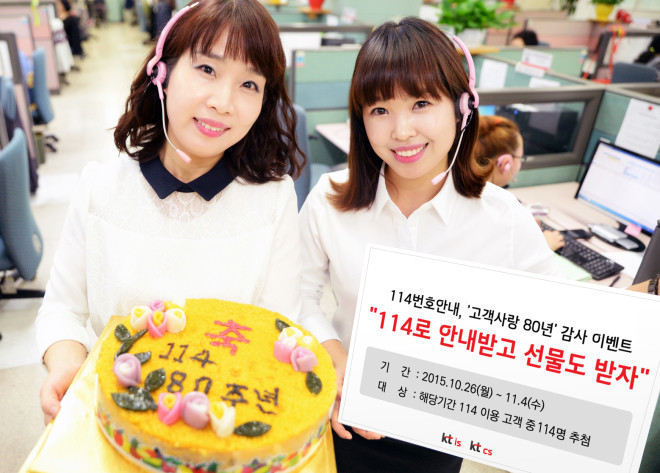 | ▲ 올해로 80주년을 맞은 114번호안내가 ‘고객사랑 80년 감사이벤트’를 실시한다고 22일(목) 밝혔다. 사진은 114 상담사들이 ‘80주년 축하’ 떡 케익을 들고 이벤트를 홍보하고 있는 모습 | ||