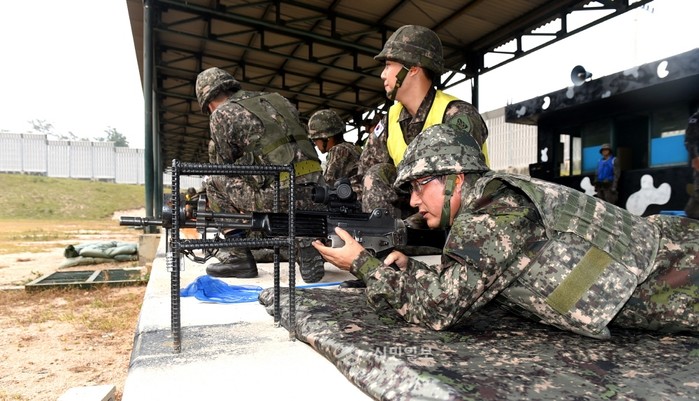 김성환 노원구청장이 지난 21일 오후 4시30분 경기 의정부시 호원동 223연대 예비군 교육장을 방문해 통합방위협의회 위원들과 함께 '예비군 훈련 안전 실태'를 점검하며 사격을 하고 있다.(사진제공=노원구청)